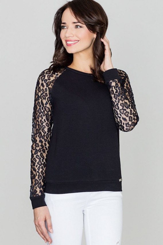 Rękawy z koronki z motywem panterki. To dzięki nim bluzka będzie odpowiednia także na bardziej wymagające okazje. Dół i rękawy wykończone mankietem, zakładana przez głowę z wycięciem w kształcie łezki z tyłu. Bluzka dedykowana pasjonatkom mody.