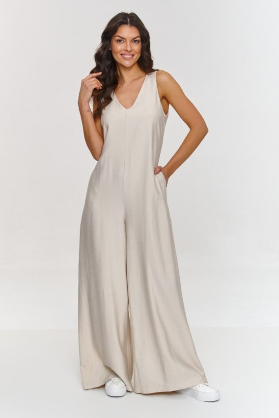 Stylowy kombinezon to świetna propozycja dla kobiet szukających modowego outfitu. Model ma subtelny dekolt w kształcie litery V, który nadaje mu eleganckiego i kobiecego wyglądu oraz dodatkowo podkreśla sylwetkę i optycznie wydłuża szyję, dodając klasy i lekkości. Szerokie nogawki oraz luźny fason sprawiają, że kombinezon jest bardzo wygodny i jednocześnie oryginalny. Model jest zapinany na zamek co ułatwia jego zakładanie, natomiast boczne kieszenie stanowią praktyczny dodatek. Dodatkowym jego atutem jest przyjemny w dotyku i przewiewny materiał co czyni go doskonałą propozycją na ciepłe dni. Dzięki prostemu, ale efektownemu fasonowi, kombinezon nadaje się zarówno na codzienne wyjścia, jak i na bardziej formalne okazje, takie jak spotkania czy wieczorne wyjścia. Można go połączyć z białymi sneakersami na co dzień lub z szpilkami na bardziej eleganckie wydarzenia.