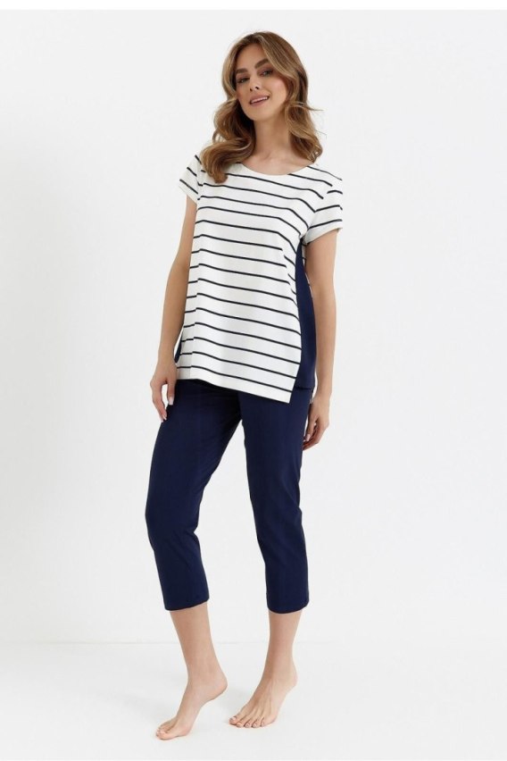Klasyczna i wygodna piżama damska, idealna na cieplejsze noce. Bluzka z krótkim rękawem i półokrągłym dekoltem zapewnia swobodę ruchów i komfort noszenia. Prosty, ponadczasowy fason sprawdzi się zarówno do spania, jak i do relaksu w domowym zaciszu. Spodnie typu 3/4 bez kieszeni mają elastyczną gumkę w pasie, która zapewnia idealne dopasowanie do sylwetki. Całość zapakowana w praktyczny woreczek foliowy, doskonała również na prezent.