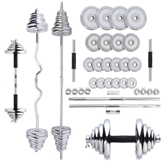 W skład zestawu wchodzą dwa krótkie gryfy, długi skręcany gryf, gryf łamany, średni gryf, który powstaje po połączeniu dwóch krótkich, osiem zacisków i łącznie 20 talerzy obciążeniowych. Całość znajduje się w wygodnej walizce. Łączna waga zestawu to 55 kg, dlatego dla łatwiejszego transportu, walizka posiada kółka, co pomaga w przemieszczaniu się ze sprzętem.
