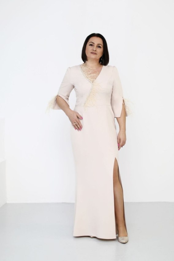 Elegancka sukienka o dopasowanym kroju, który perfekcyjnie podkreśla sylwetkę, tworząc zmysłową, ale zarazem subtelną propozycję na wyjątkowe okazje. Dekolt sukienki ozdobiony jest piórami oraz dekoracyjną taśmą, co dodaje jej niezwykłego blasku i elegancji. Rękawki 3/4 z wycięciem zostały również ozdobione piórami oraz dekoracyjną taśmą, co tworzy spójną, efektowną całość. Zamek z tyłu zapewnia wygodę przy zakładaniu sukienki, a seksowne rozcięcie na dole subtelnie eksponuje nogi, wprowadzając odrobinę drapieżnego charakteru. Sukienka jest na podszewce, co zwiększa komfort jej noszenia. Długość maxi dodaje całości klasy i sprawia, że sukienka jest idealna na eleganckie przyjęcia czy wieczorne wyjścia.