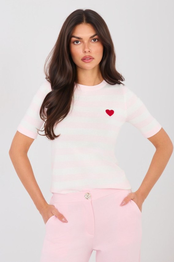 Stylowy sweter damski w paski to idealna propozycja dla kobiet ceniących wygodę i modny, casualowy styl. Klasyczny wzór w paski nadaje mu ponadczasowego charakteru i sprawia, że doskonale wpisuje się w codzienne stylizacje. Model o standardowej długości świetnie układa się na sylwetce, a krótki rękaw zapewnia komfort noszenia, szczególnie w cieplejsze dni lub jako element warstwowych zestawów. Okrągły dekolt podkreśla uniwersalny charakter swetra i sprawia, że pasuje zarówno do jeansów, jak i spódnic czy eleganckich spodni. Sweter wykonany jest z wysokiej jakości mieszanki wiskozy i poliestru, dzięki czemu materiał jest miękki, przyjemny w dotyku oraz odporny na zagniecenia. Urokliwym akcentem jest wyhaftowane serduszko na wysokości piersi po lewej stronie, które dodaje całości subtelnego, kobiecego charakteru. To doskonały wybór na co dzień do pracy, na spotkanie z przyjaciółmi czy spacer.